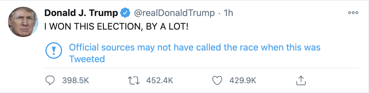 周六上午,特朗普发推特称,“我赢得了这场选举,大赢特赢!”但这条消息很快被推特贴上了一个带有感叹号的标签,上面写道:当这条推文发出之时,官方来源还没有宣布这场竞选(的结果)。