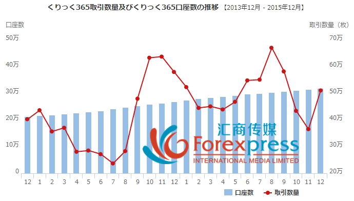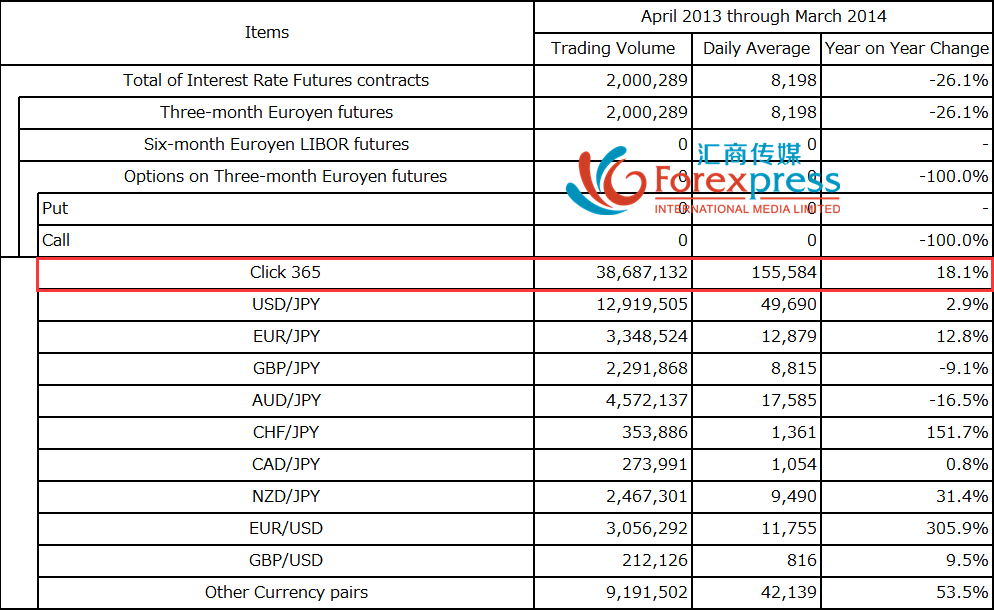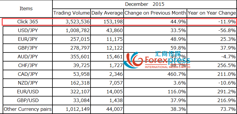 在日本东京金融交易所外汇保证金Click365方面,2016年1月6日,外汇保证金超过5000亿日元,创下纪录新高。2015全年外汇保证金合约未38,687,132份,日均交易量为155,584日元。