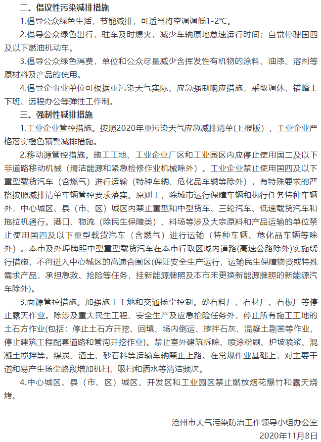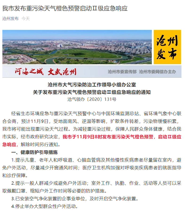 据沧州发布微信公众号11月8日消息,预计11月9日,受地面南风、逆温等影响,扩散条件转差,污染物缓慢积累,沧州市将可能出现重污染天气过程。为减轻重污染过程,保障人民群众身体健康,结合我市实际,经市政府研究决定,沧州市于11月9日8时发布重污染天气橙色预警,启动Ⅱ级应急响应,解除时间另行通知。