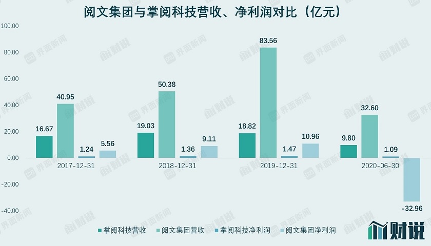 由于阅文集团尚未公布2020年三季报,这里均用半年报的数据作比较。数据显示,2020年上半年,掌阅科技营收为9.8亿元,而阅文集团则高达32.6亿元;掌阅科技实现净利润1.09亿元,与此同时由于计提减值损失,阅文集团上半年亏损32.96亿元,2019年实现盈利10.96亿元。