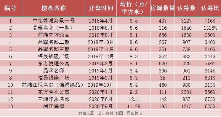 根据界面楼市不完全统计,2018年至今前滩已有11个项目开盘入市,共带来4358套房源,分别来自于晶耀名邸、晶萃名邸、东方逸品、东方悦耀、中粮前滩海景壹号、福晟钱隆广场、江悦名庭、东方惠礼、三湘印象名邸、浦江海德。