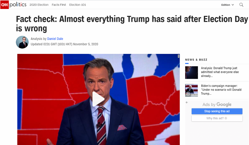眼看可能落选,票选结果出炉前,特朗普竞选团队声称已在多州发起法律诉讼,要求拜登胜选的威斯康星州重新计票,审查密歇根州计票,停止宾夕法尼亚、佐治亚州计票。