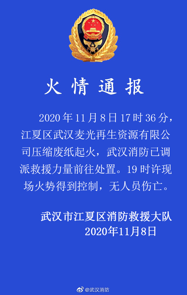 据@武汉消防 微博消息,11月8日17时36分,江夏区武汉麦光再生资源有限公司压缩废纸起火,武汉消防已调派救援力量前往处置。19时许现场火势得到控制,无人员伤亡。