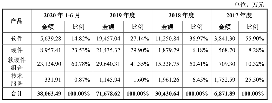 营收构成方面,2017年软件收入为3841.3万元,占比55.9%,这一比例逐年降低,到2020上半年已经下降到14.82%,与此同时,软硬件组合收入比例在上升,从2017年的10.32%上升至2020年上半年的60.78%。