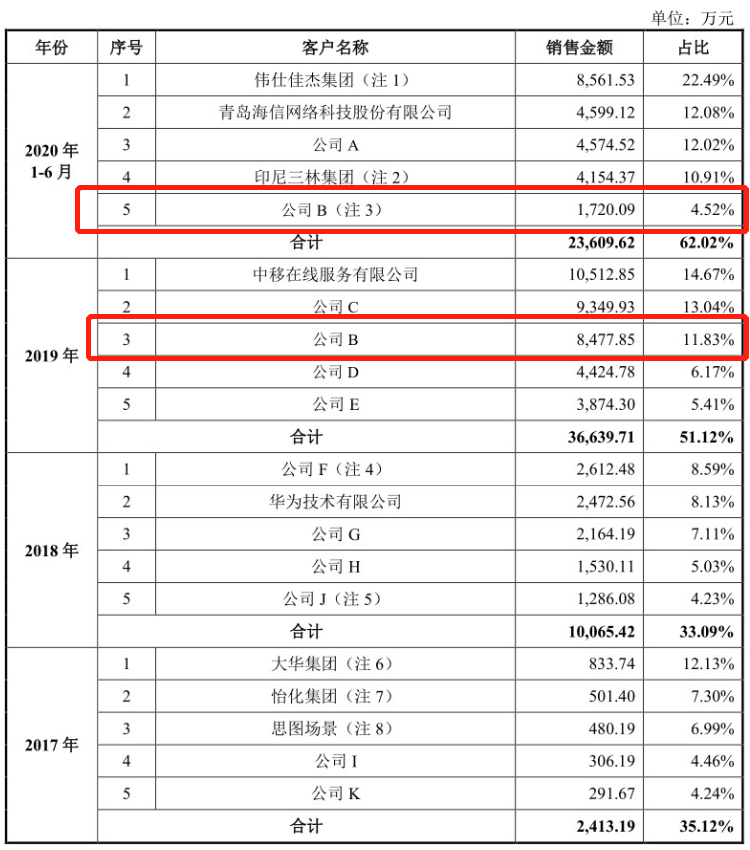 2019年,公司B是依图科技第三大客户,销售金额为8477.85万元,占比为11.83%。2020年上半年,公司B位列第五大客户,销售金额为1720.09万元,占比为4.52%。
