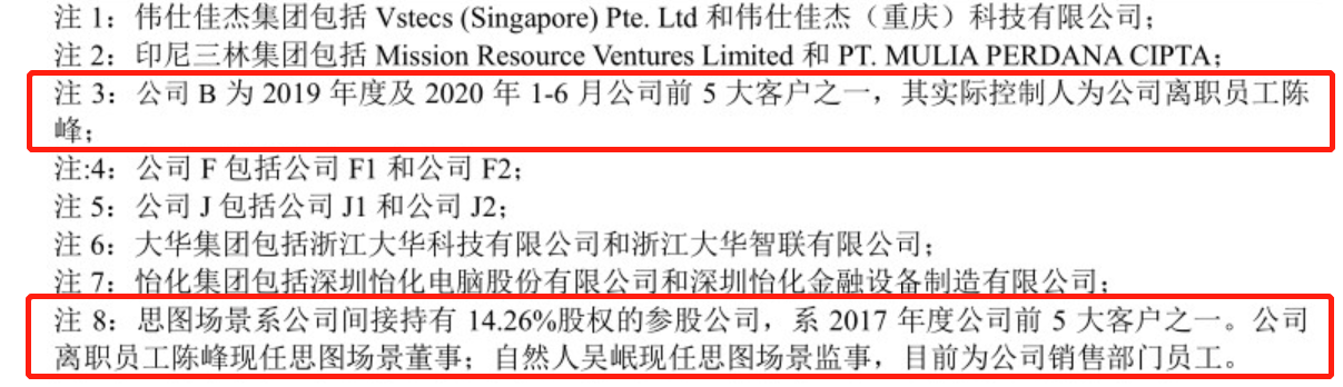 在表格的注3中显示,公司B实际控制人为公司离职员工陈峰。而在注8中又提到,公司离职员工陈峰现任北京思图场景数据科技服务有限公司(下称思图场景)董事。