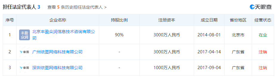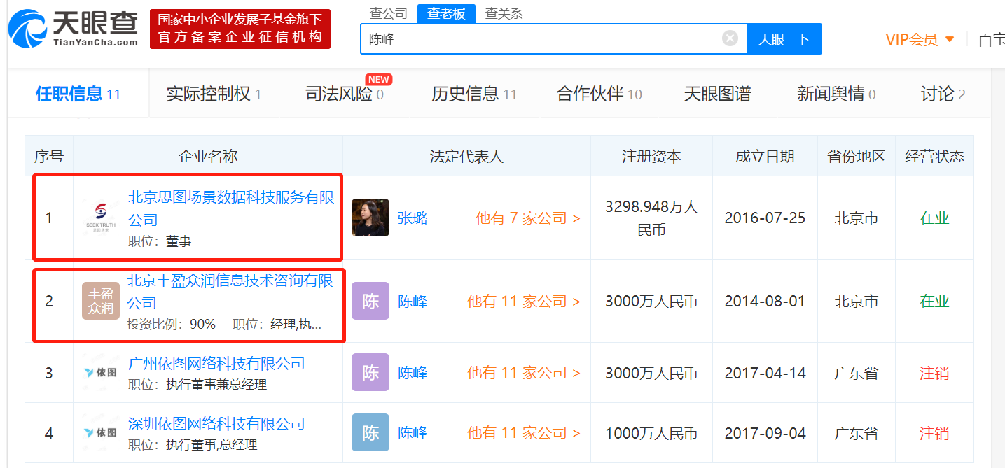 招股书中没有明确思图场景董事陈峰和公司B实际控制人陈峰是否为同一人。界面新闻查看了思图场景高管名单,根据天眼查APP显示,陈峰确实曾担任思图场景董事,同时,其名下还持股北京丰盈众润信息技术咨询有限公司(下称北京丰盈)90%的股份,这也是他唯一作为实控人持有的公司。此前,陈峰曾在广州依图网络科技有限公司和深圳依图网络科技有限公司任职,这两家公司目前都已经注销。