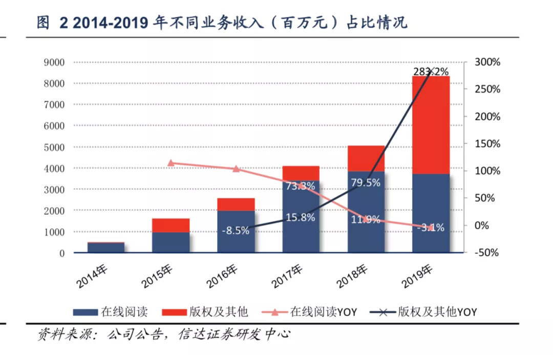 2018年,阅文的在线业务业务(付费阅读、网络广告及游戏分销收入)占比进一步下降,版权及其他业务(制作和发行影视、动画、授权版权改编权、运营自有网络游戏、销售自营图书等获得的收入)占比不断上升。到了2019年,版权及其他业务占比超过在线业务。