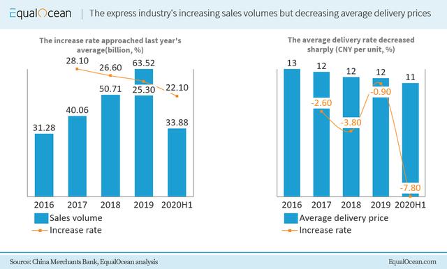 在线消费需求的增长有助于提高快递行业的利润,但价格战也降低了其增长率,因为平均交付价格已大大降低。