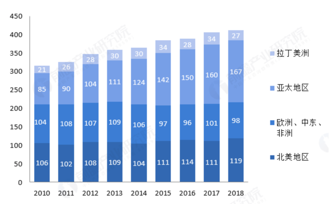 ▲2010-2018年全球电影票房区域分布情况(单位:亿美元)