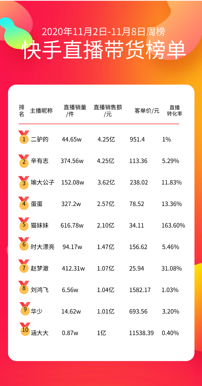 值得注意的是,这次榜单的Top10销售额都已经破亿,相比其他平台的主播,其整体实力都是很强的!