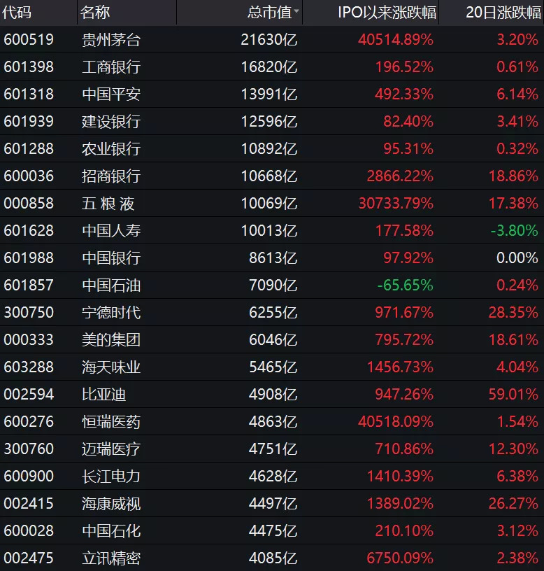 如海康威视、美的集团、长城汽车等股价在盘中创新高。同时,宁德时代、美的集团、比亚迪以及海康威视的总市值已经排在A股市值最大20家公司之列。