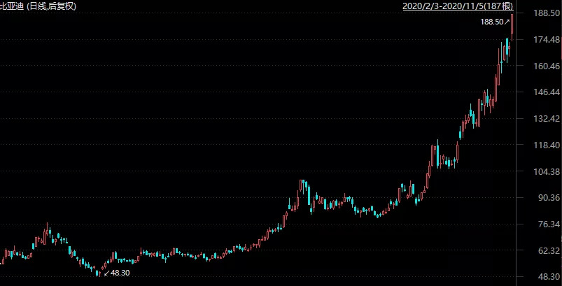 比亚迪新能源车的大卖,其股价也表现突出,年初至今股价涨幅达到288.01%,成为A股千亿市值中涨幅最好的公司。