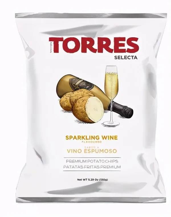 但对于不爱酒精但愿意尝试酒味的消费者来说,无酒精酒味零食则是更加适宜的选择。西班牙的轻奢薯片品牌Torres推出了一款起泡酒味薯片,用1%的跳跳糖复刻起泡酒口感,用6%的气泡酒酸甜果味调味,带有葡萄酒的香甜气息,口味独特新颖。