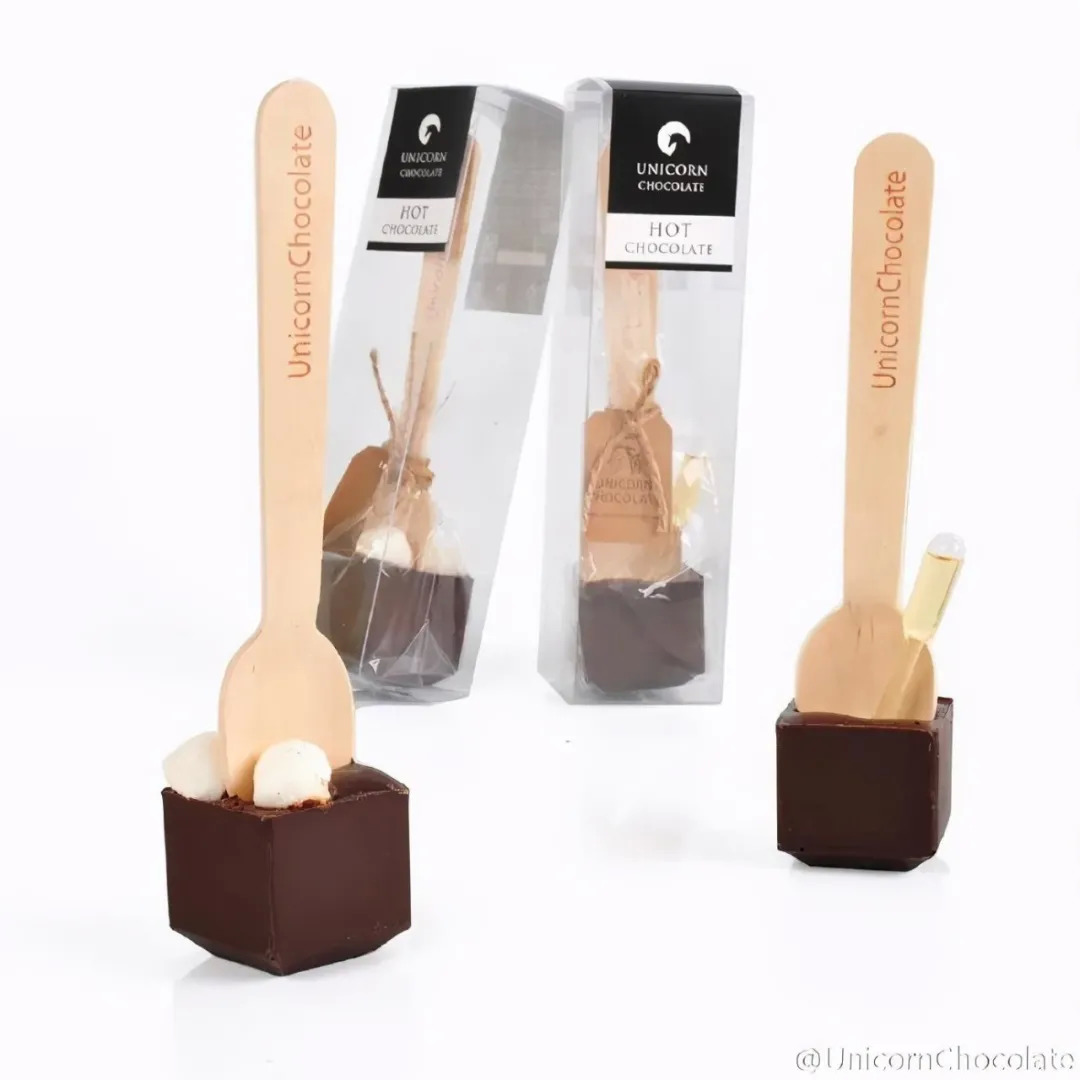 UnicornChocolate推出的热巧克力棒在造型上别出心裁,威士忌款巧克力棒上插着一根小试管,里面装着少量威士忌酒,可以自行添加。