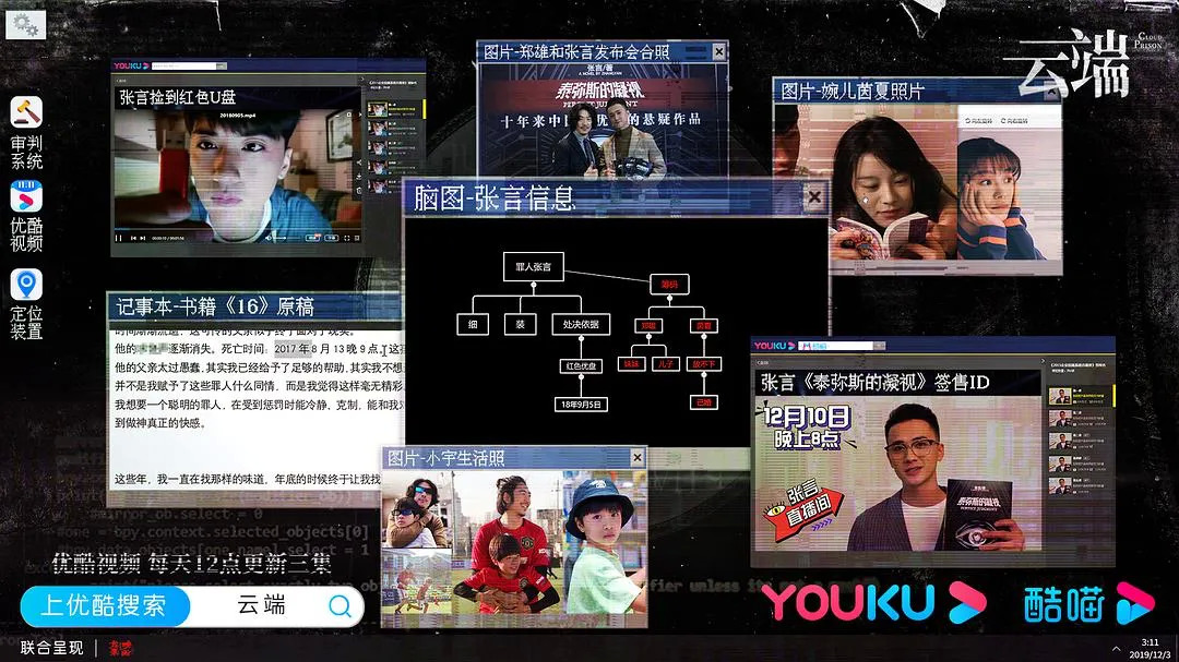 《云端》的第一个镜头从Windows10登陆界面开始,未知的操作者登陆微博搜索着悬疑推理小说家张言的公开信息,然后黑进张言的网盘,随意浏览着他的私人资料,一边搜索,一边记录“罪人张言”的导图。通过网络上公开和非公开的信息,一个陌生人就此对张言了如指掌。
