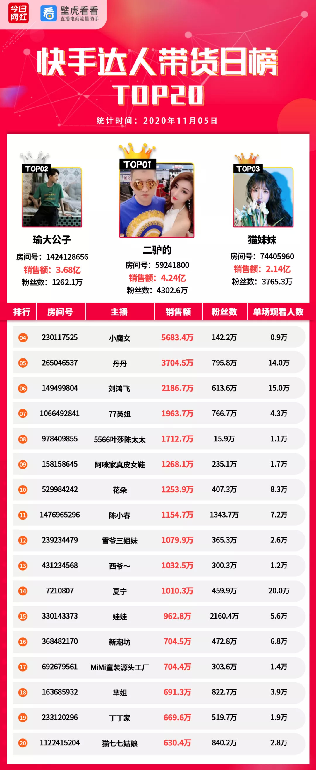 据今日网红与壁虎看看联合发布的《快手达人带货日榜TOP20》显示,粉丝数与销售总额并无直接关系。11月5日,位列第四名的小魔女,粉丝量仅有第五名丹丹的五分之一,但销售总额超出其近两千万。