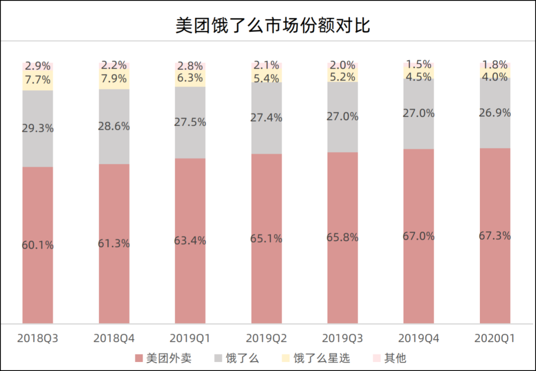 之前我们说了,狭义的数字经济平台大概是“7:2:1”格局,确定了之后就很难翻盘,下图美团饿了么的市占率稳得很。