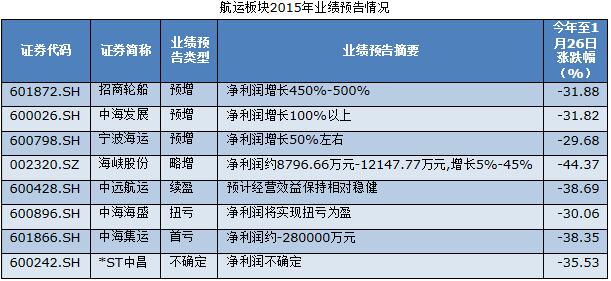当中吸引眼球的当属招商轮船(601872.SH),其预计2015年净利润增长达到近500%,中海发展(600026.SH)也表示业绩预增在100%以上。