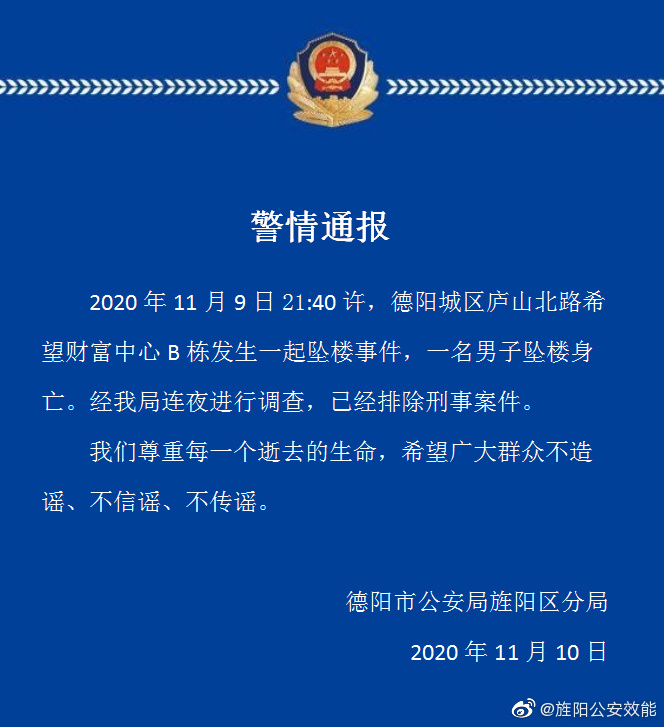 据四川省德阳市公安局旌阳区分局官方微博@旌阳公安效能 11月10日通报,11月9日21:40许,德阳城区庐山北路希望财富中心B栋发生一起坠楼事件,一名男子坠楼身亡。经公安局连夜进行调查,已经排除刑事案件。我们尊重每一个逝去的生命,希望广大群众不造谣、不信谣、不传谣。