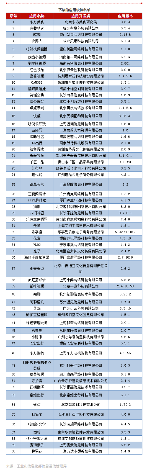 11月10日,工业和信息化部通过其微信公众号“工信微报”通报称,10月26日,工业和信息化部向社会通报了131家存在侵害用户权益行为APP企业的名单。截至目前,经第三方检测机构核查复检,尚有60款APP未按照工业和信息化部要求完成整改(名单见附件)。依据《网络安全法》和《移动智能终端应用软件预置和分发管理暂行规定》(工信部信管〔2016〕407号)等法律和规范性文件要求,工业和信息化部组织对上述APP进行下架。