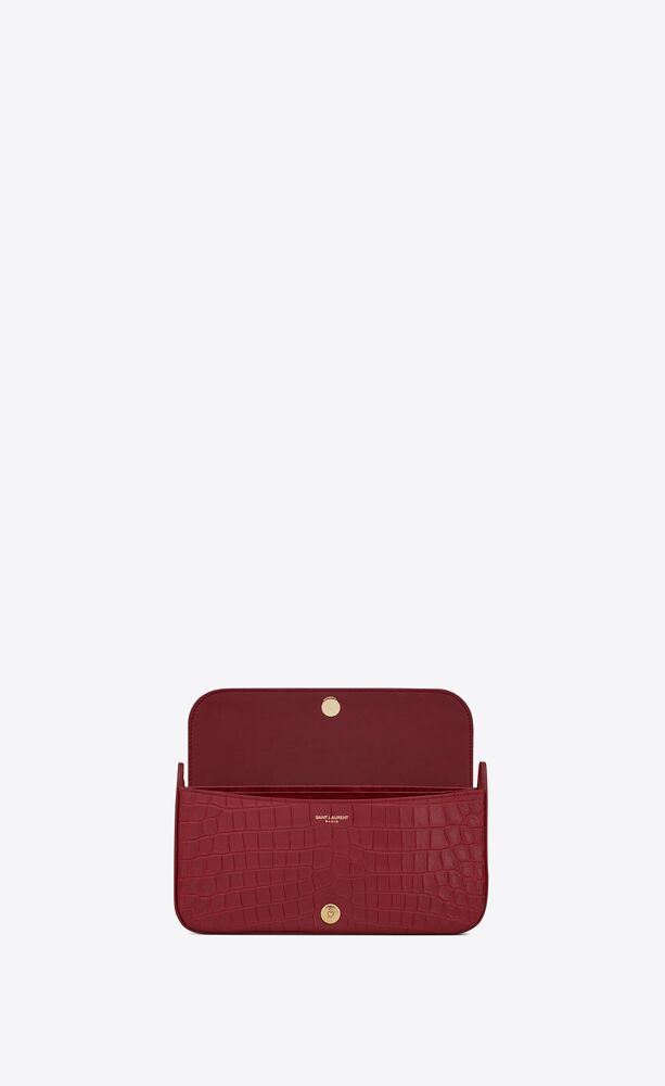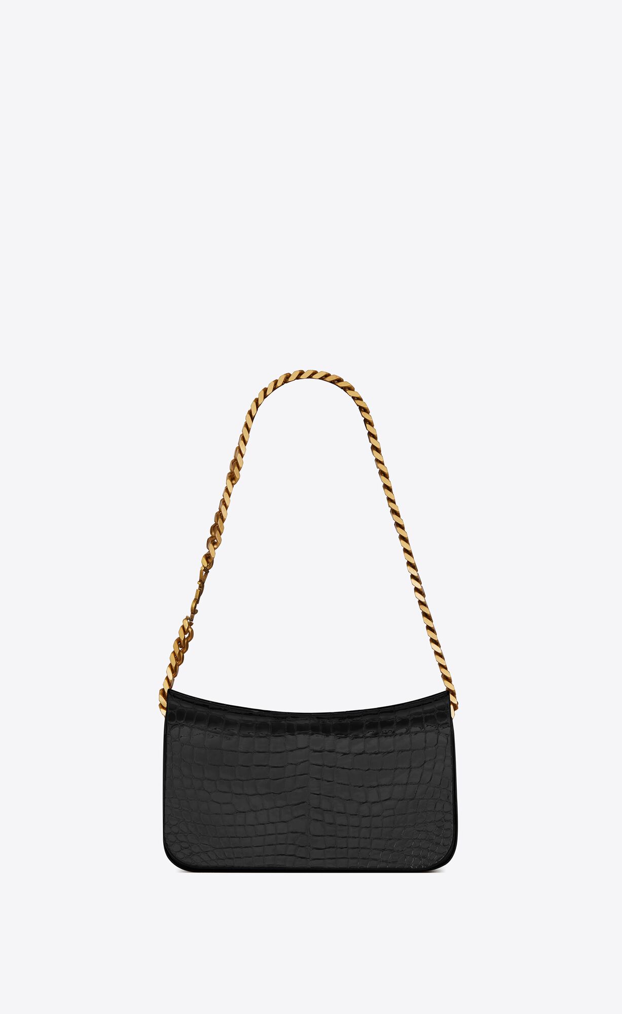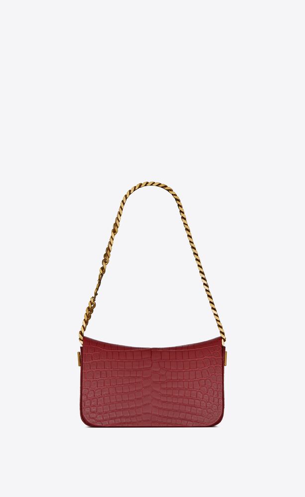 全新的Elise系列手袋采用当下大热的腋下包设计,包袋顶部采用弧形设计,整体廓形流畅简约,金属链条搭配纯色皮质,除了链条上品牌标识YSL字样,再无过多的缀饰,简洁而高级。Elise系列共有两款不同设计,鳄鱼纹压印皮革包袋系列有黑色和红色两种设计,亮面小羊皮包袋则仅有黑色一款,两种包袋均采用了以及麂皮衬里设计。此外,Elise系列的包袋链条还可以拆卸,不仅可作腋下包使用,还可以将链条卸下当作手拿包使用。