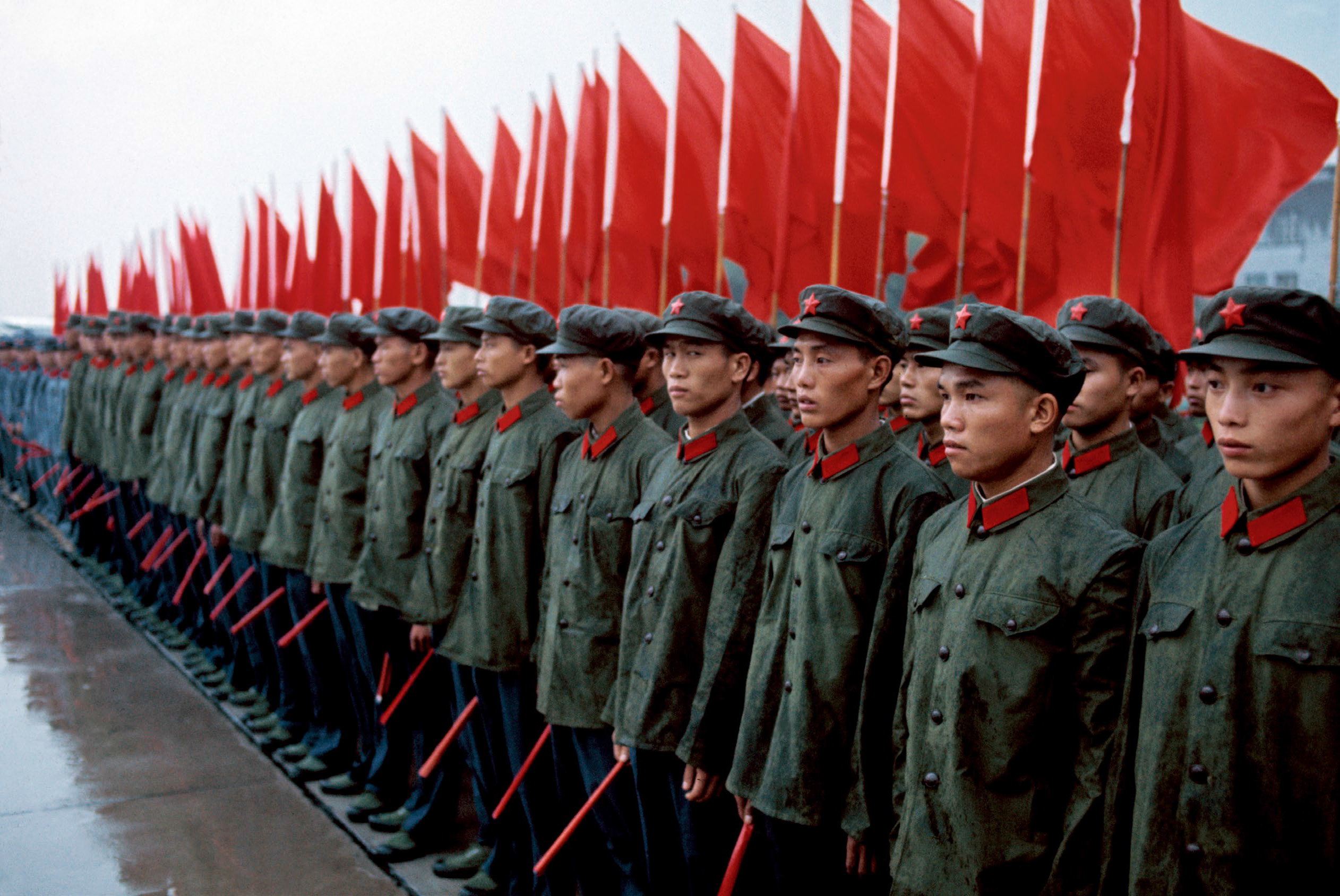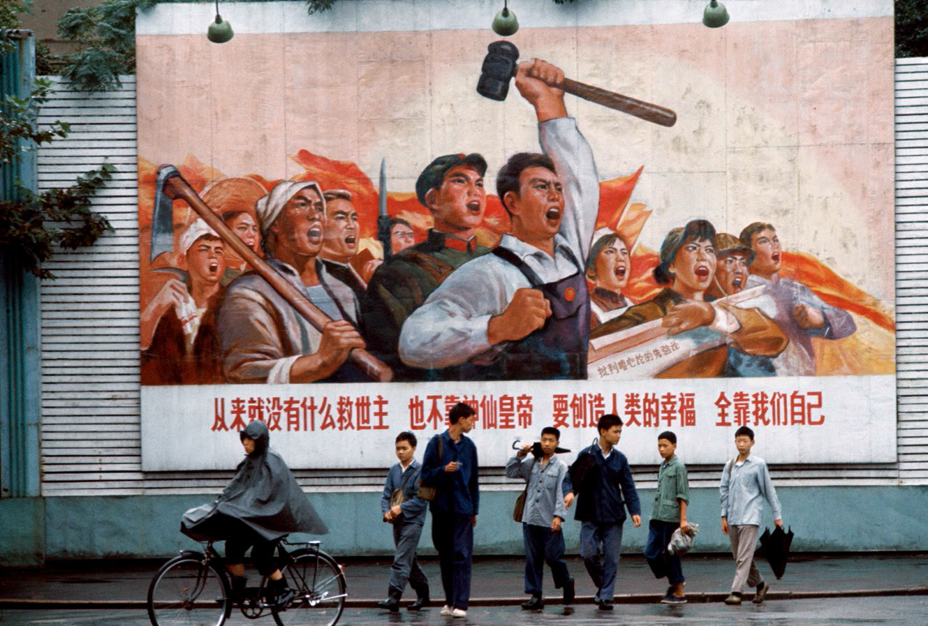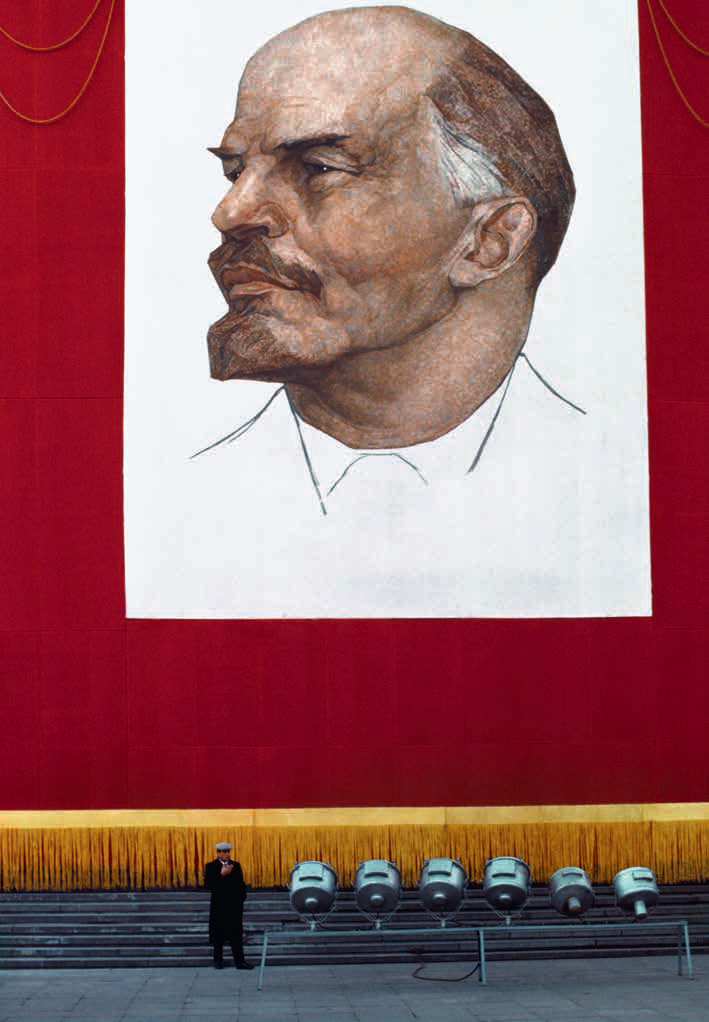 在这两张照片中,色调浓艳的宣传画、鲜红的旗帜与人们身上的灰、绿、蓝形成对比。