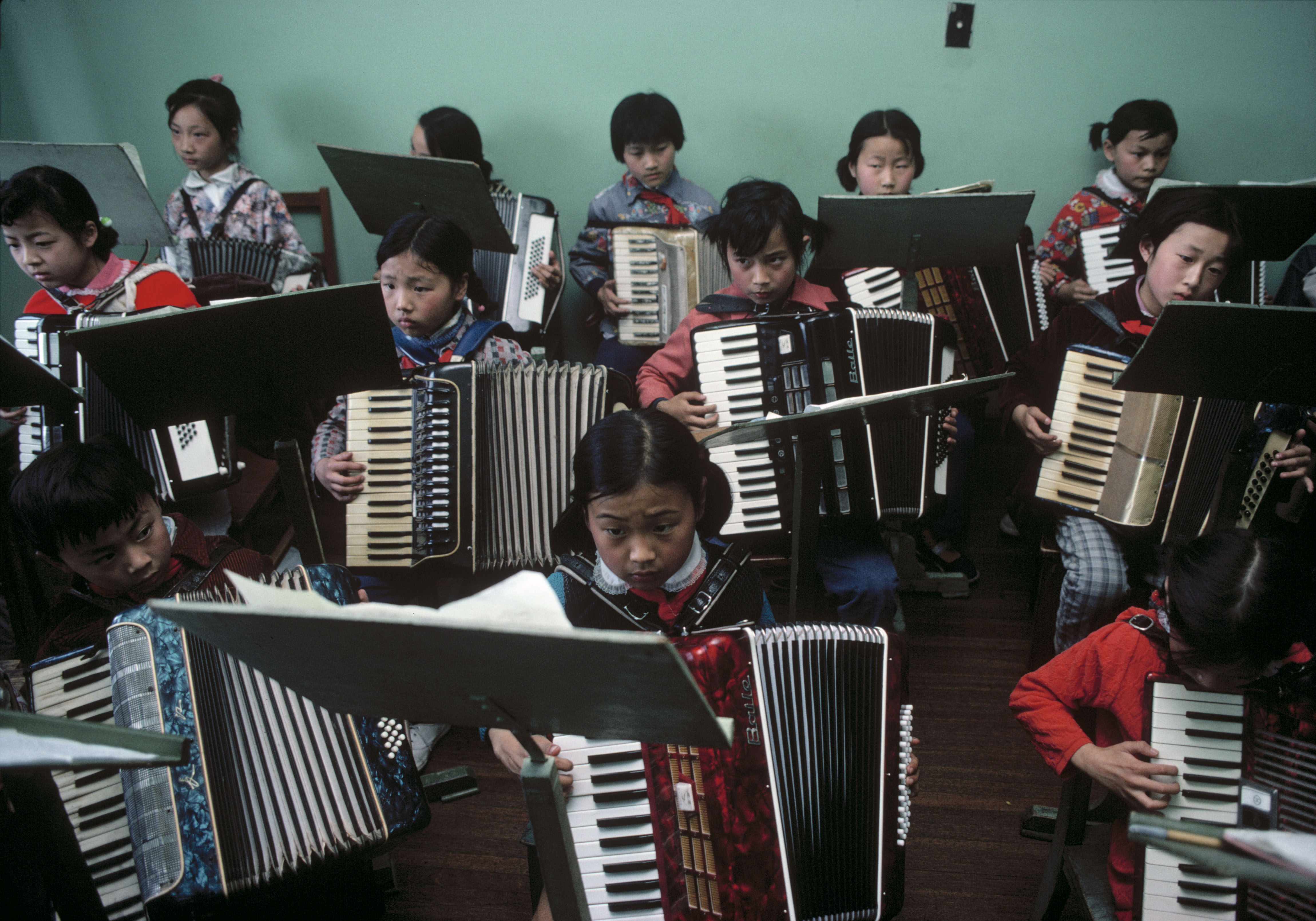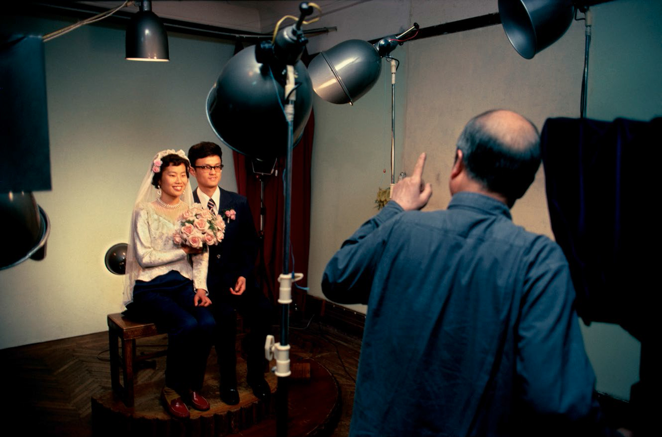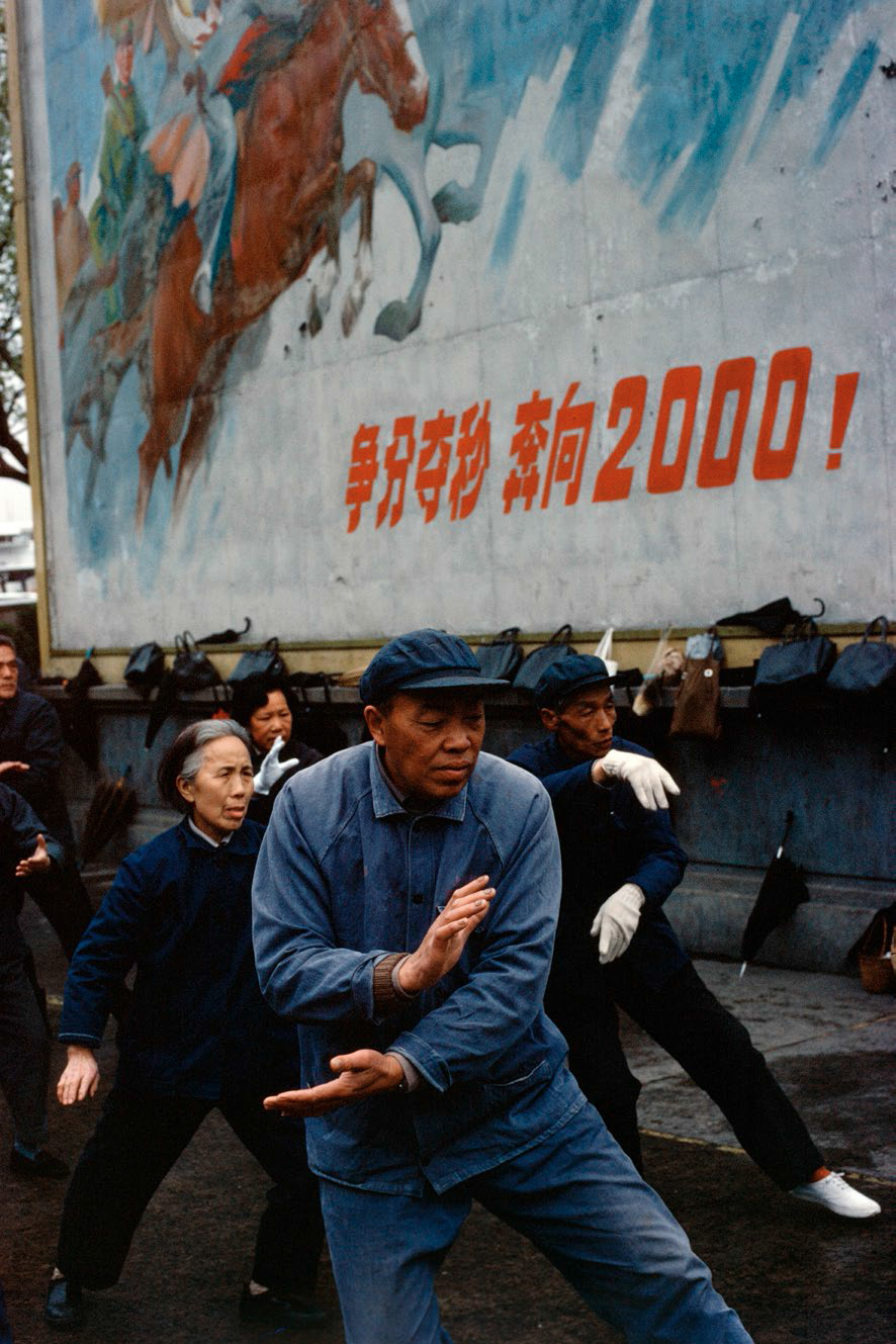 改革开放之初的上海似乎洋溢着悠闲的情调,手风琴、西式婚礼服装又重新回到这座摩登都市,吃茶的“旧式”生活复苏,如雨后萌芽,人们的衣着还是单调朴素的蓝灰绿。在后这张照片中,一群人在“争分夺秒奔向2000”的标语下打太极,反差中有种幽默感。巴贝在拍摄这张照片时不知道这句标语的意思,但摄影师的直觉告诉他,这类政治宣传标语很有趣,值得记录。