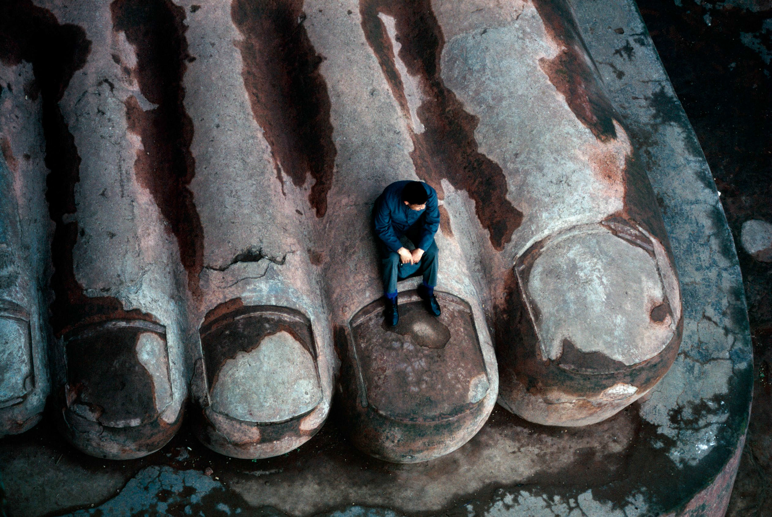 大佛在“文革”里沦为“四旧”,一个男子若有所思地坐在大佛脚趾上,仿佛被遗弃的神与迷失的人重逢相会。今天有无数的人对大佛顶礼膜拜,却很难再有图片抓住往日的神思。