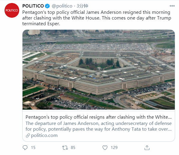 美国政治新闻网站Politico 11月10日消息,美国国防部高级政策官员詹姆斯·安德森(James Anderson)在与白宫发生冲突于今晨辞职。此前一天,特朗普表示,他解雇了国防部长马克·埃斯珀(Mark Esper)。