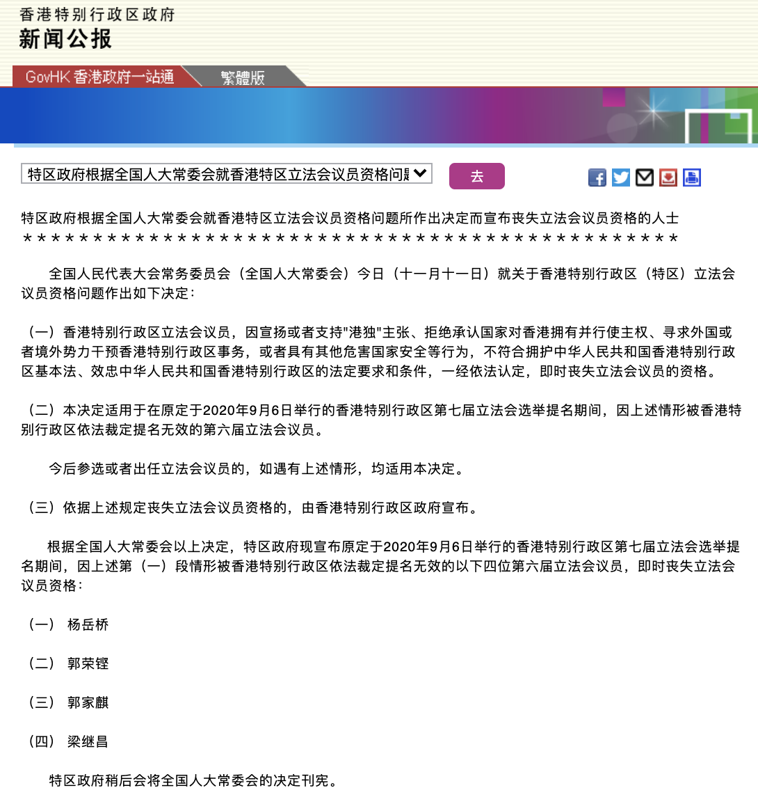 香港特区政府网站11日发布新闻公报,根据全国人大常委会就香港特区立法会议员资格问题所作出决定而宣布丧失立法会议员资格的人士。