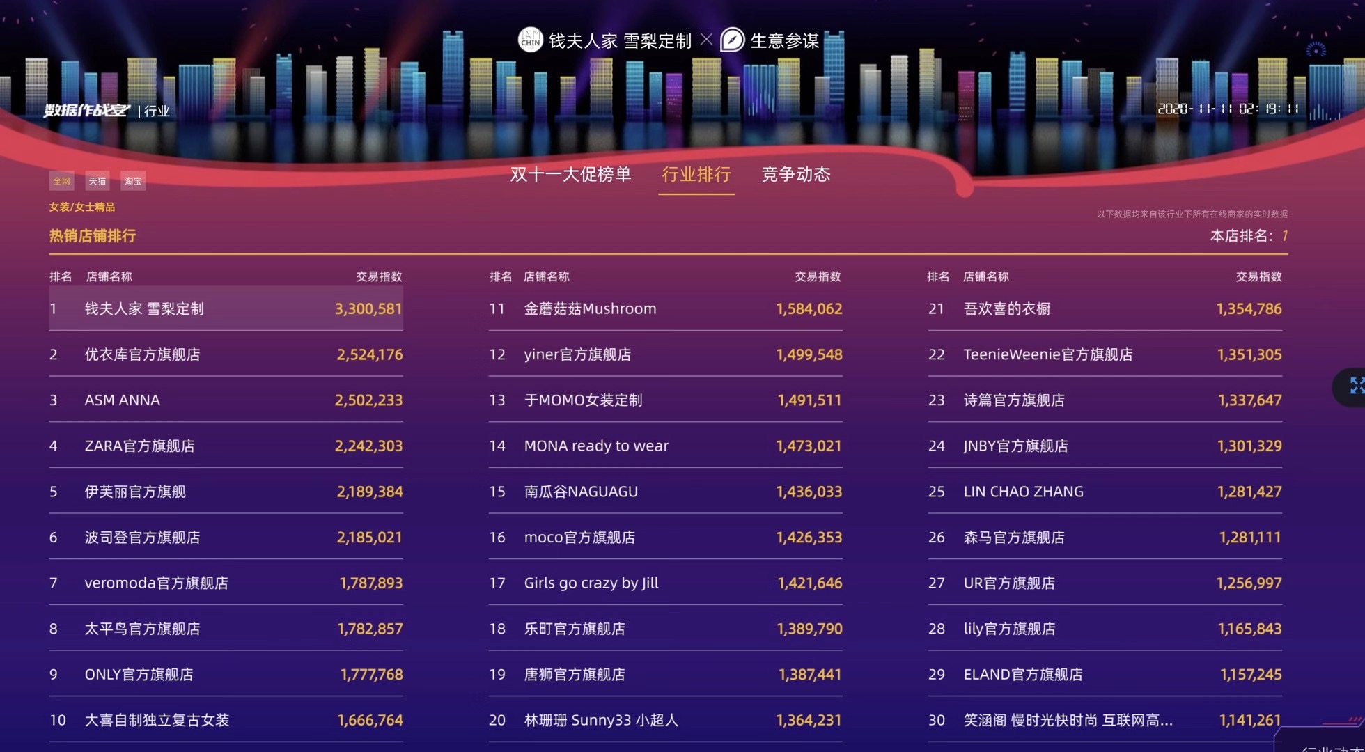 根据数据作战室数据,11月11日0点刚过2小时19分,女装/女士精品热销店铺排行榜中的第一名是淘宝店“钱夫人家 雪梨定制”,交易指数远超一向坐拥双11女装“龙头”的优衣库。