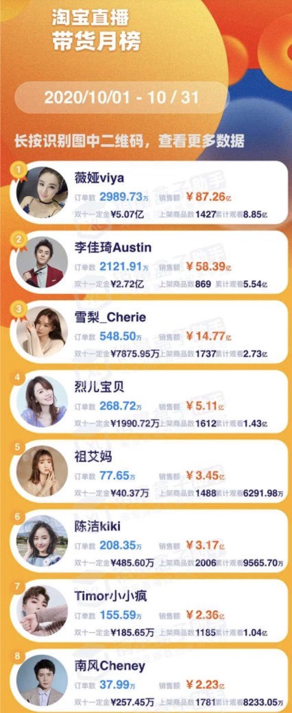 而在淘系平台上,主播分层的现象就更为严重。根据淘宝直播10月份的榜单,薇娅和李佳琦这样的头部主播销售额超过50亿,比第十名主播的带货量多了几十倍,而top20开外的主播则差距更大。