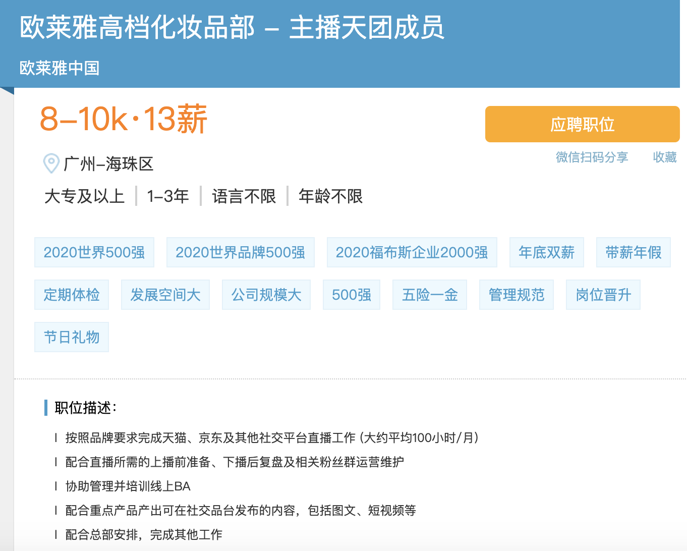 将商家自播做得最为风生水起的品牌之一还有李佳琦的“老东家”欧莱雅。目前,欧莱雅在各大平台都有自己的品牌直播,包括淘系平台、京东和小红书等。近期,界面新闻在招聘网站上发现,欧莱雅正在招募自己的“主播天团”。