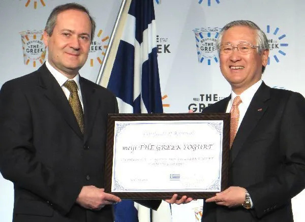 2018年9月9日,希腊驻日本大使卡斯·卡拉索利斯与明治社长川村一夫共同出席“明治希腊酸奶”新品发布会。图片来源:ssnp.co.jp