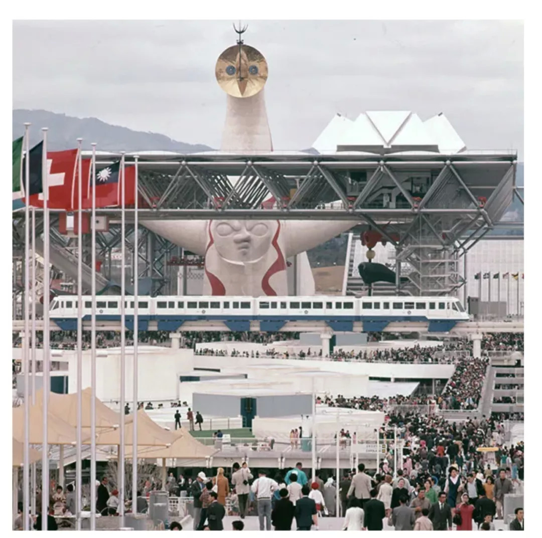 1970年的大阪世博会上,备受争议的标志性建筑物——太阳塔“站”在主场馆中心,注视着络绎不绝的游客。图片来源:第一财经