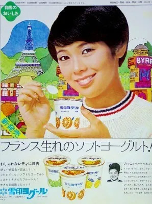不只是明治,雪印在此期间也紧跟流行趋势。他们在1969年推出第一款带有果肉的酸奶,风靡一时。产品口感与一般的果味酸奶截然不同,真实的果肉嚼在口中,带来十足的满足感。雪印还请到当时玉女偶像岡崎友紀作为代言人,是日本昭和时代向往洋风的一个缩影,直到现在还被老一辈人所怀念。