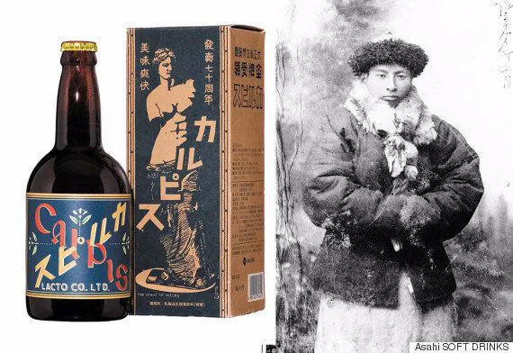 Calpis于1919年推出的第一款乳酸菌饮料,右边是其创始人三岛海云。图片来源:www.huffingtonpost.jp
