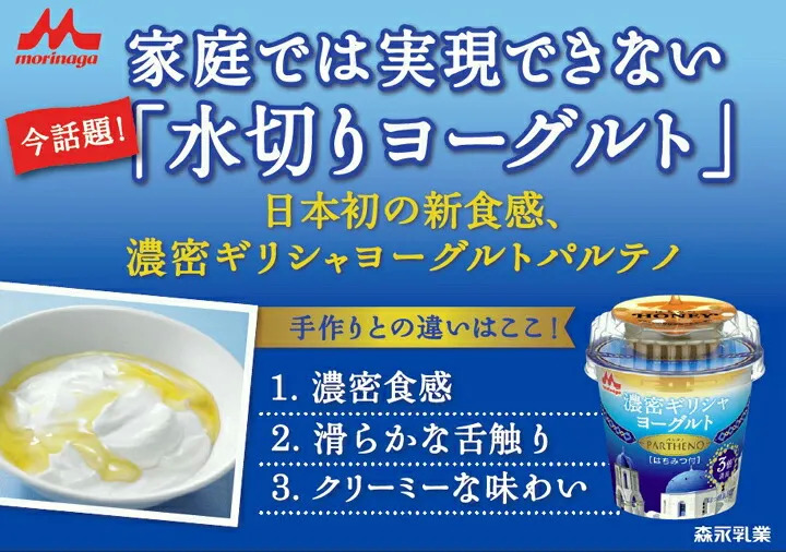 希腊酸奶在这个时期也有突飞猛进的发展。森永在2011年9月推出日本第一款希腊酸奶「濃密ギリシャヨーグルト パルテノ」。产品完全继承了希腊酸奶的浓稠特点,据说将汤匙插入其中,杯体倒置,勺子也不会掉下。光滑的奶油质感,超高蛋白含量,搭配蜂蜜的贴心设计,产品名称和杯身设计上典型的希腊元素,都让这款产品在当时十分抢眼。