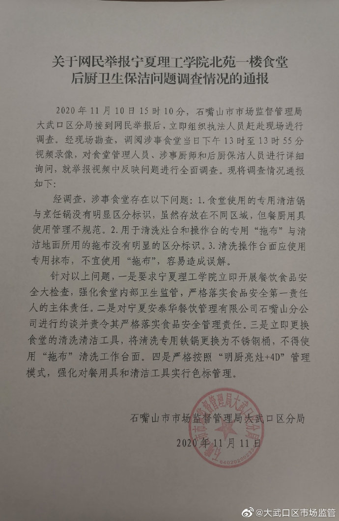 据宁夏石嘴山@大武口区市场监管 微博11日消息,针对网民举报宁夏理工学院北苑一楼食堂后厨卫生保洁问题,经调查,食堂使用的专用清洁锅与烹饪锅没有明显区分标识,虽然存放在不同区域,但餐厨用具使用管理不规范。用于清洗灶台和操作台的专用“拖布”与清洁地面所用的拖布没有明显的区分标识。清洗操作台面应使用专用抹布,不宜使用“拖布”,容易造成误解。