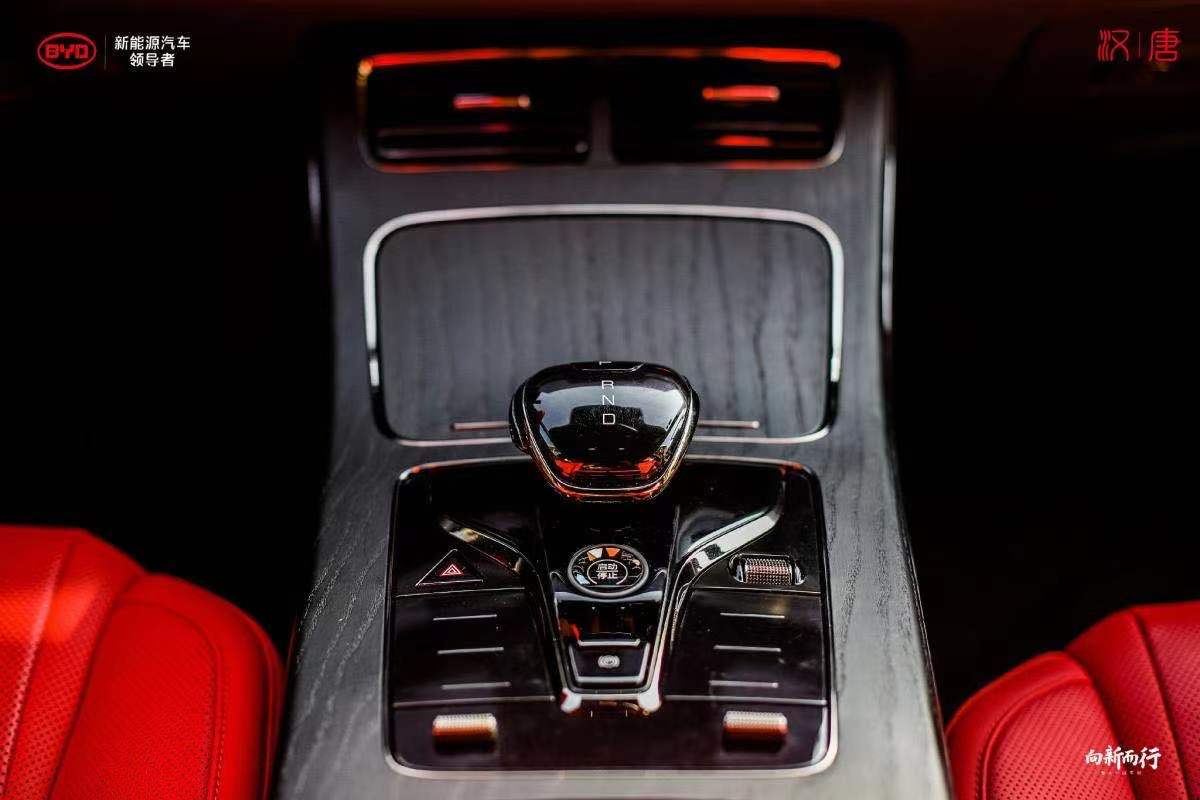 我们将目光放大来看,比亚迪确确实实在汉车型上下本了,在相机镜头中很难找到一丝丝廉价的质感。尤其喜欢中控档把处的设计布局,游艇式电子换挡机构配上中文标示,一切显示都十分清晰直观,无处不在的龙纹缝线,更是让车内的豪华质感得到巨大提升。
