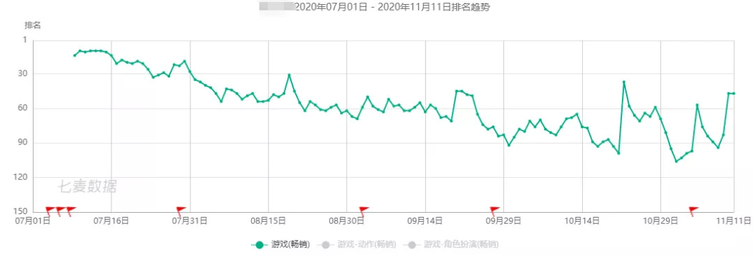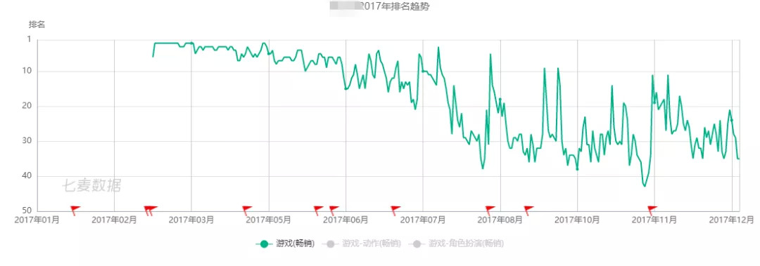 从上面两张图可以直观的看到,某款产品的第一代在发行约10个月后,一直稳定在畅销榜的30名左右,而在今年发布的产品,仅仅2个月后就已经掉到了90名左右。