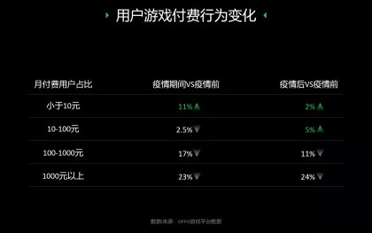 但是,OPPO在9月份的开发者大会上曾对旗下的游戏用户做过这样一个数据统计,用户的付费习惯转变:月付费1000元以上的用户在疫情期间下降了23%,疫情结束以后虽有回升,单相比疫情前仍然是明显下降的,与此同时,小额多次付费提升明显。