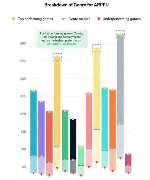 我们发现,在7日留存、28日留存,以及ARPU、ARPDAU等几个关键指标上,RPG和SLG均有着高度的相似性,尤其是ARPU与ARPDAU上几乎拉开了其它品类两倍左右。