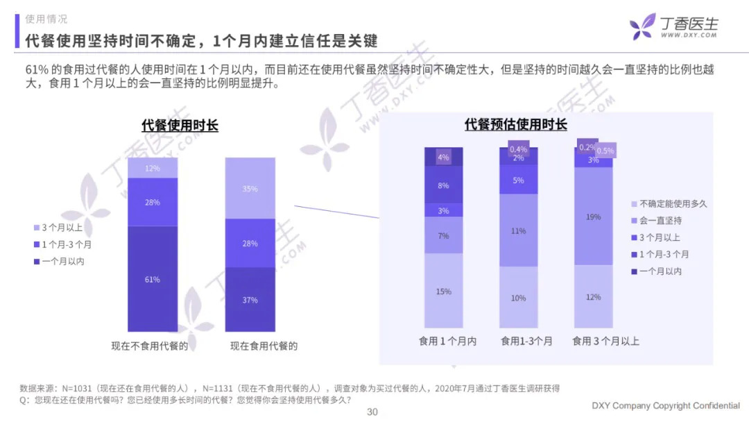 根据丁香医生数据研究院发布的《代餐行业营销洞察报告》,购买代餐的用户坚持使用的不确定性很大,但如能使用1个月以上,留存率就会明显提升,因此品牌方应当设法帮助用户度过1个月的“代餐适应期”。