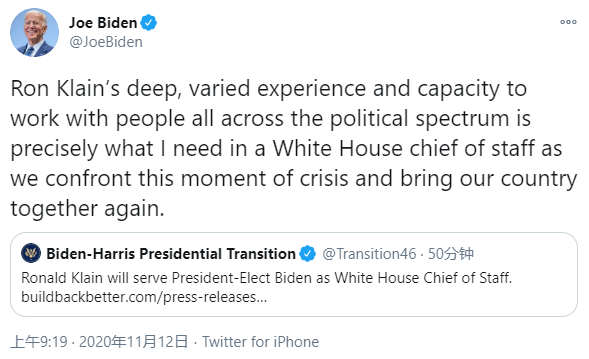 当地时间11月11日,美国“当选总统”拜登刚刚发推表示:“罗恩·克莱因(Ron Klain)具有的与所有政治派别人士合作的深厚而丰富的经验与能力,正是我们在面对这一危机时刻以及让我们的国家重新团结起来时,我所需要的白宫办公室主任(应具备的)。”
