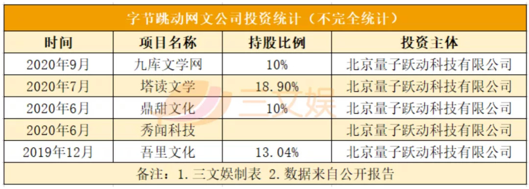 在入股掌阅之前,字节跳动还在去年和今年投资了吾里文化、秀闻科技、鼎甜文化、塔读文学、九库文学网五家网文公司。吾里文化已签约作者 4000 余位,储备有 6000 余部影视版权作品,而秀闻科技背后的磨铁集团,已经在影响领域有了不少成功的 IP 孵化案例,包括《从你的全世界路过》《少年的你》等。