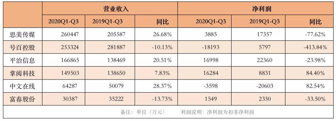 从公布的财务数据报告看,六家主营业务含网文的上市公司中,前三季度有四家营业收入同比上升:
