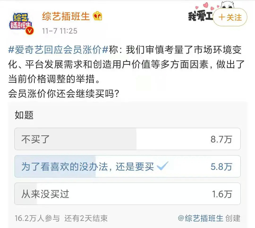 爱奇艺对标的奈飞几次价格调整后出现过退订潮,在爱奇艺回应会员涨价之后,微博账号“综艺插班生”发起了一项投票:会员涨价你还会继续买吗?16.2万人参与的投票中,有8.7万超过一半的人数投给了“不买了”。