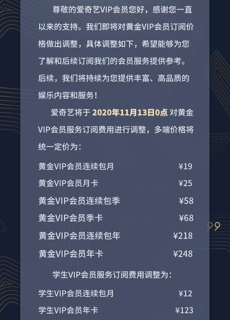 前些天,微博账号爱奇艺VIP会员发布通知称,将在2020年11月13日0点开始,对VIP会员服务订阅费用进行调整,黄金VIP会员连续包月19元,单独购买月卡25元。